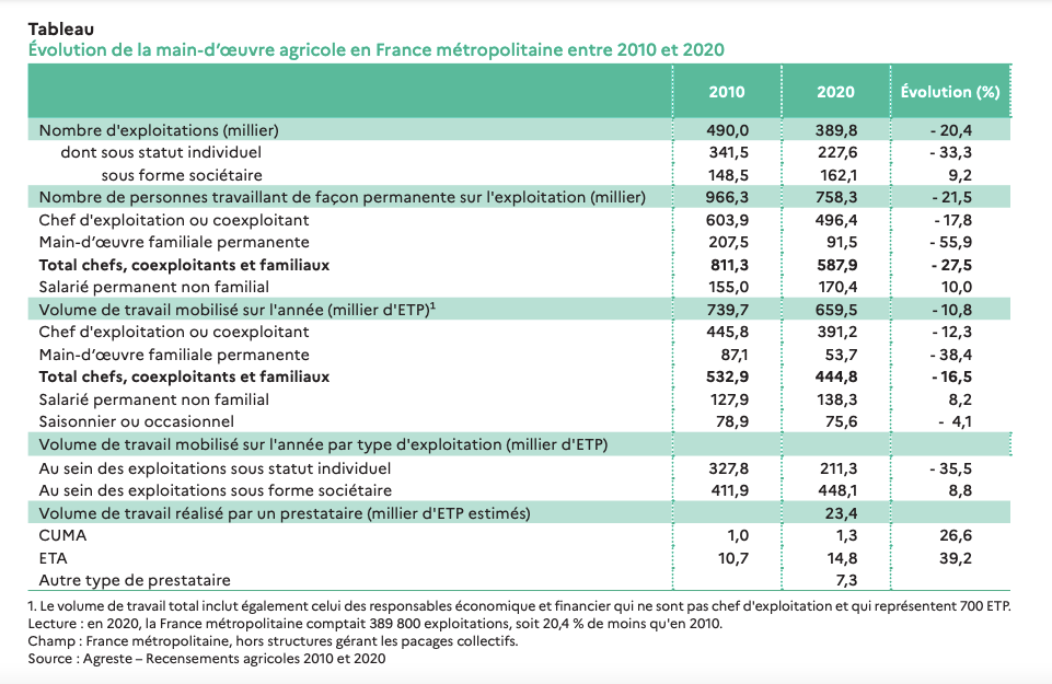 Comme nous l’avons dit en introduction, il convient aussi d’aller voir concrètement quels sont les rapports sociaux à l’œuvre dans les champs. Les Soulèvements de la Terre, dans leur communiqué de soutien à la « paysannerie », en plus de reproduire les habituels clichés gauchistes en matière de critique du productivisme, comparent les paysans à des chauffeurs Uber qui ne seraient pas vraiment propriétaires de leurs moyens de production. Cette comparaison, bien que facile et pratique pour une certaine rhétorique politicienne, ne tient absolument pas pour une raison simple. Quel est le moyen de production pour des travailleurs et travailleuses de plateforme ? Ce n’est au fond ni la voiture ou le vélo, c’est la plateforme en tant que telle. Sans algorithme pour organiser le travail et mettre en réseau les restaurants, impossible de récolter la moindre commission, et c’est parce qu’ils et elles sont ainsi indirectement des salarié-es des plateformes, que les livreur-ses luttent pour obtenir le statut légal correspondant. Dans l’agriculture ce n’est pas la même chose : bien que, pour partie, les agriculteurs soient endettés jusqu’au cou, hypothéquant terrain, ferme et tracteur, ils en restent propriétaires. La rhétorique les comparant aux travailleurs de plateforme se fonde sur leurs positions défavorables dans les chaines de valeur de l’agro-industrie, devenant ainsi, apparemment, des receveurs d’ordres des grosses centrales d’achat de l’alimentaire. Sauf qu’une position défavorable dans des chaines de valeur ne définit pas une condition prolétarienne ; elle est précisément définie à l’inverse, par sa dépossession. Ainsi, bien qu’une analyse des positions dans les chaines de valeur demeure cruciale pour comprendre la structure du secteur et celle du mouvement en cours, et ainsi la potentielle contradiction entre les petits et les gros, elle n’est en rien constitutive d’une condition prolétarienne. Preuve en est que les salarié-es agricoles sont visiblement absent-es de ce mouvement, ce qui n’a pas grand-chose d’étonnant au vu des intérêts fondamentalement contradictoire qu’ils ont avec leurs patrons. Pour donner une idée de la salarisation contemporaine dans le secteur agricole, il faut savoir que la chute de 966.000 actif-ves en 2010 à 758.000 en 2020 est principalement due à l’effondrement de la main d’œuvre familiale de 207.000 à 91.000 et à la disparition de plus de 100.000 chefs d’exploitation ou coexploitants. Cette tendance est contre-carrée par désormais plus de 170.000 actif-ves du secteur qui sont des salarié-es permanents non-familiaux, un chiffre qui a tendance à augmenter. Si on y ajoute les saisonniers, alors une personne sur 3 bossant dans les champs est salariée. Par ailleurs comme mentionné précédemment, on assiste au déclin de la main d’œuvre familiale (principalement les femmes et les enfants), tandis que son temps de travail diminue beaucoup moins rapidement et donc s’intensifie.