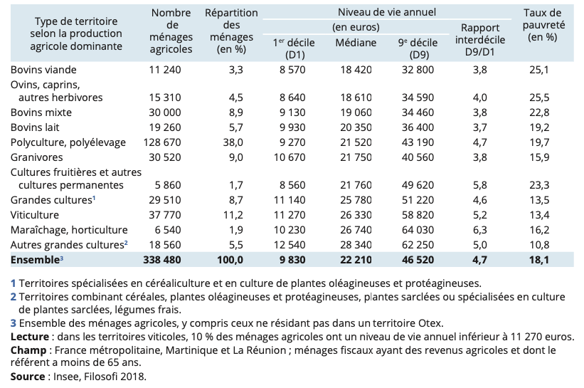 Il faut aussi observer la structure des revenus de manière générale et en fonction des secteurs. Si, comme le ressassent les médias, un ménage agricole sur cinq vit sous le seuil de pauvreté en France, en termes de secteurs on s’aperçoit qu’il s’agit en réalité d’un ménage sur quatre dans l’élevage, contre un sur dix dans les céréales et les grandes cultures. La distribution des revenus va dans le même sens.