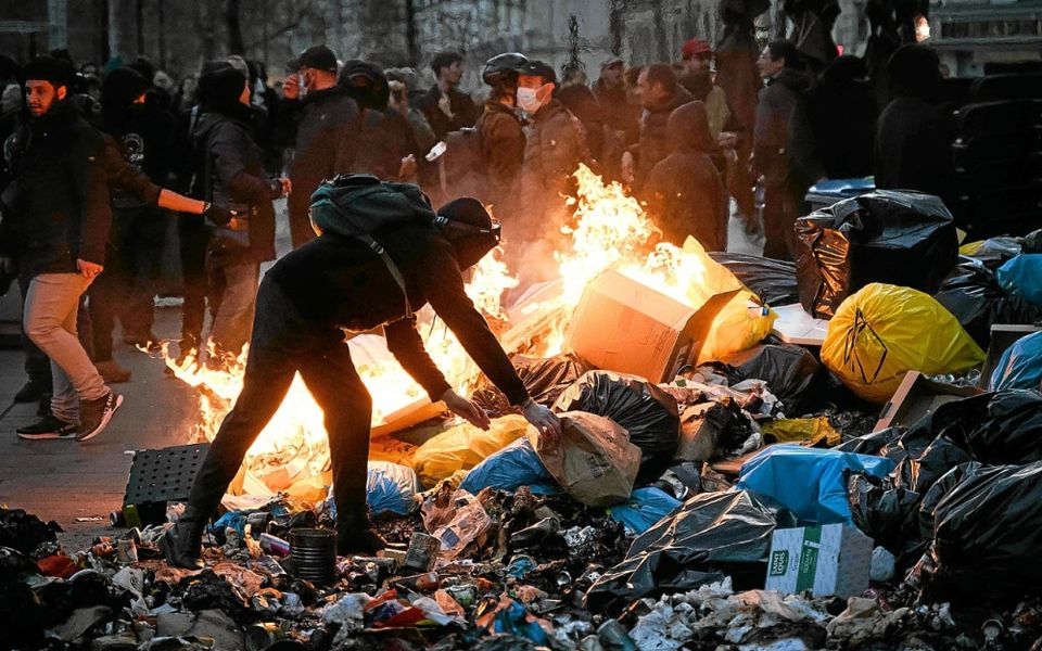 Certains secteurs comme celui des éboueur·ses intensifient leur grève, qui se double de blocages quotidiens dans les raffineries et la collecte des poubelles (public comme privé). Malgré le faible taux de grévistes, ces actions peuvent avoir lieu grâce à l’appui d’autres franges du mouvement, comme les “autonomes” ou encore les lycéen·nes et les étudiant·es qui entrent massivement dans la mobilisation à partir du 9 mars et la soutiennent sur les blocages, les piquets volants ou via leur participation à des caisses de grèves. La gauche fait de son mieux pour “mettre la France à l’arrêt” mais rien n’y fait car le 16 mars, malgré tous ces efforts, Elisabeth Borne annonce son intention de recourir au 49.3. Des manifestations spontanées se tiennent alors à Paris et dans d’autres villes de France et tournent à l’émeute, ponctuées de multiples rassemblements très mobiles et d’incendies de poubelles. Bien que les interdictions de rassemblement se systématisent dès le surlendemain, les manifestations nocturnes se poursuivront tous les soirs jusqu’au 23 mars et de façon tout aussi violente. Le rejet de la motion de censure transpartisane, déposée en grande pompe par le groupe parlementaire centriste LIOT le 20 mars à l’Assemblée Nationale, ne calmera pas les choses.